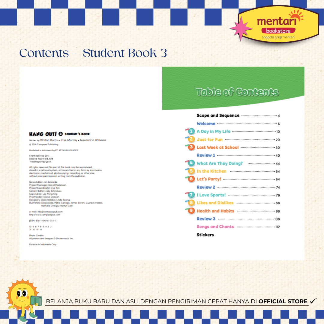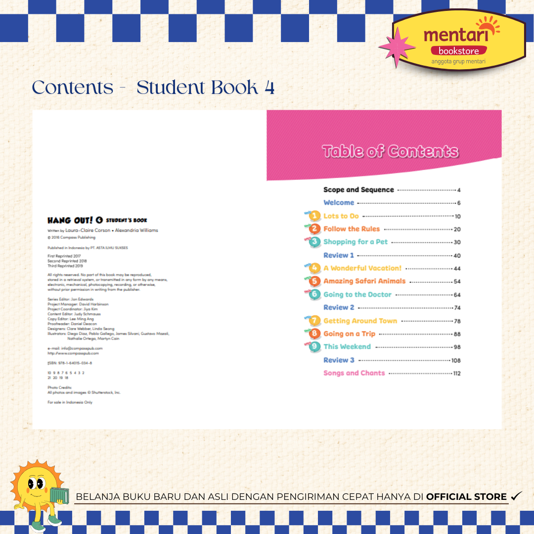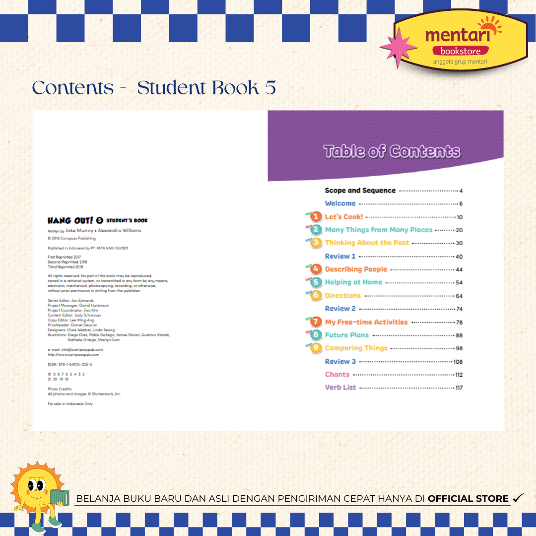Setiap unit di dalam Hang Out dilengkapi dengan percakapan, cerita, lagu, nyanyian, serta aktivitas yang melatih keterampilan membaca, menulis, mendengarkan, dan berbicara. Dilengkapi dengan karakter yang menarik dan latihan yang variatif, Hang Out menjadi pilihan tepat untuk membantu anak belajar Bahasa Inggris dengan cara yang menyenangkan dan efektif.